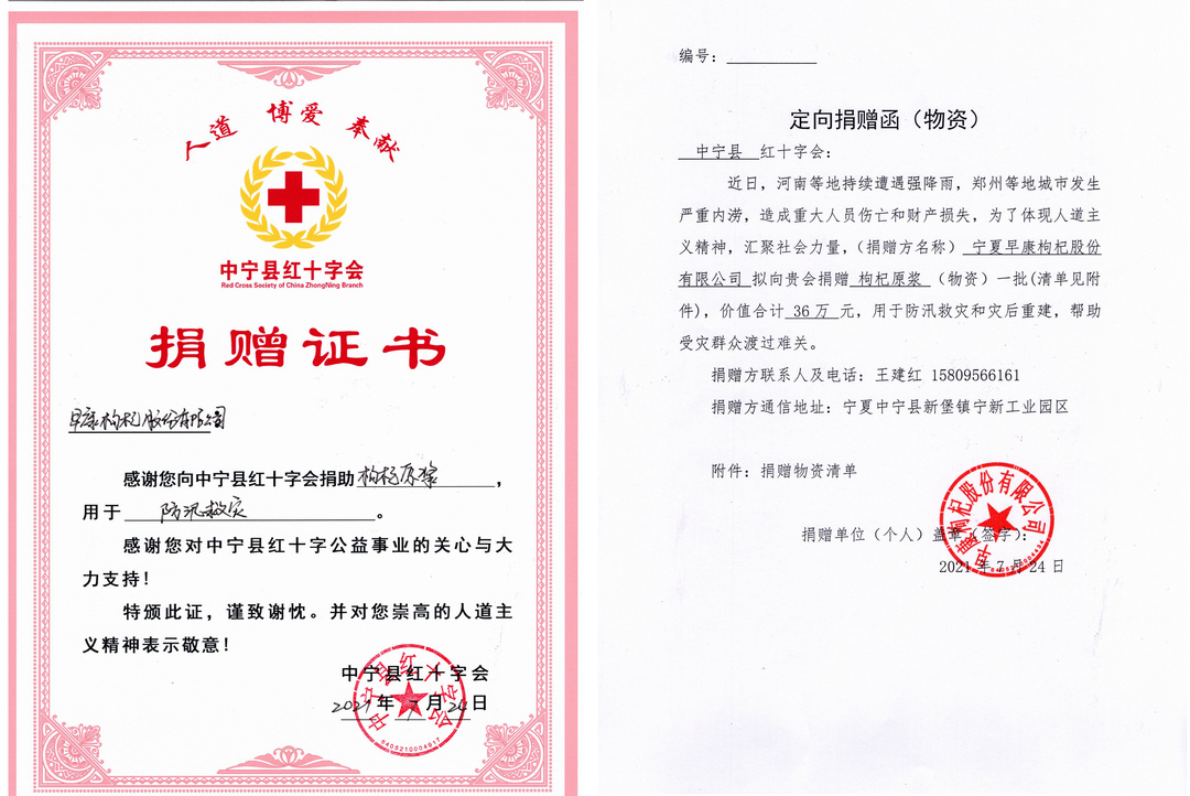 為馳援河南人民對(duì)抗暴雨災(zāi)害,7月24日,早康枸杞向中寧縣紅十字會(huì)捐贈(zèng)價(jià)值36萬(wàn)元物資,用于防汛救災(zāi)和災(zāi)后重建。
